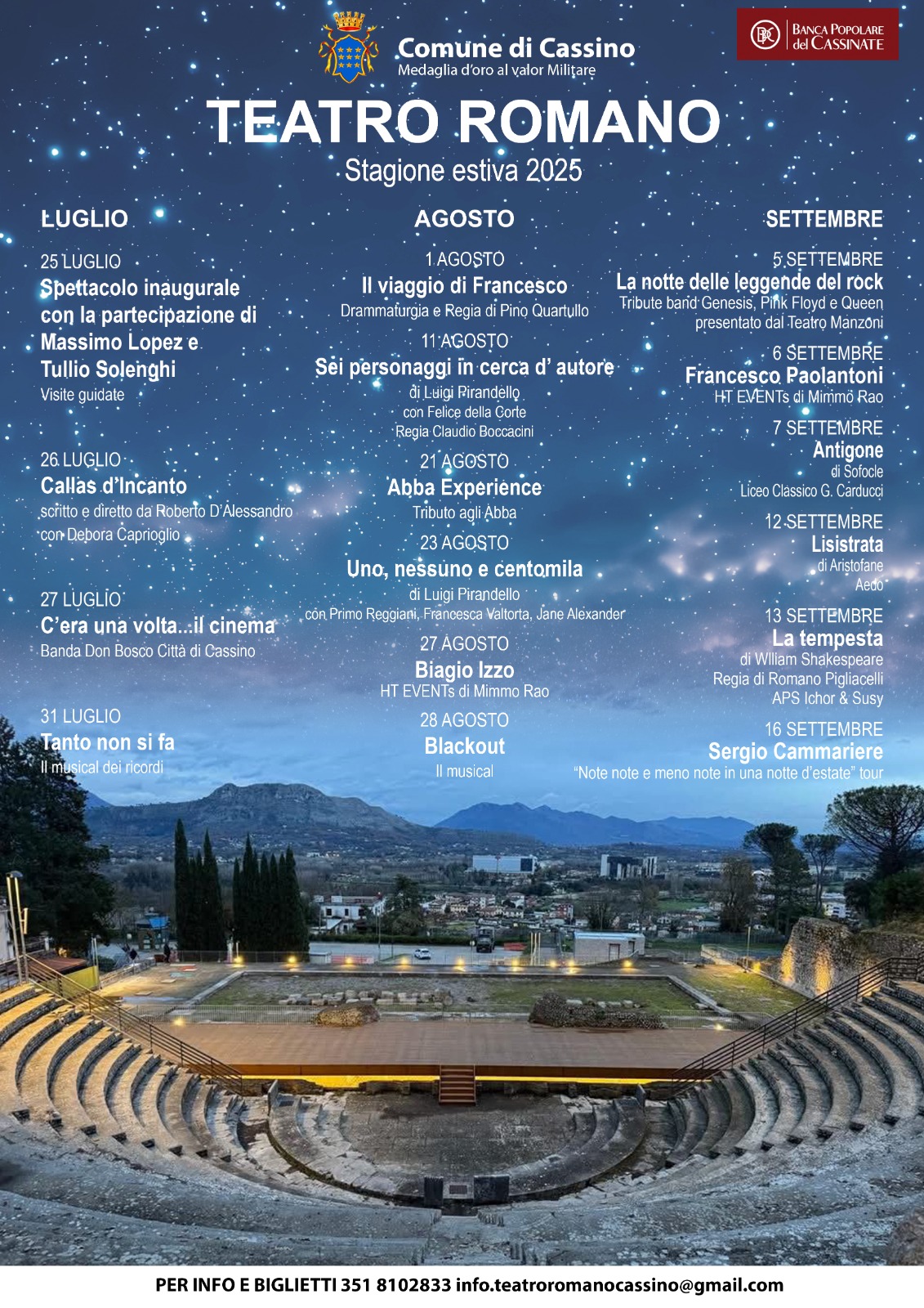 Per info e biglietti degli eventi in programma presso il Teatro Romano, è possibile contattare il seguente numero di telefono 351.8102833 o inviare una mail a info.teatroromanocassino@gmail.com