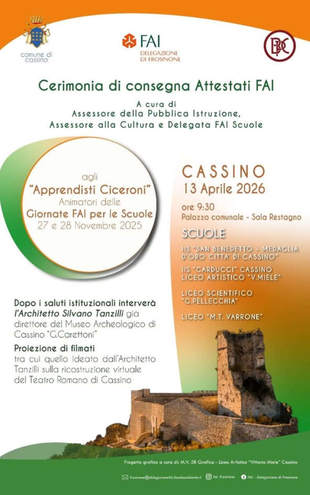 Si terrà lunedì 13 aprile 2026, alle ore 9:30, presso la Sala Restagno del Palazzo Comunale di Cassino, la Cerimonia di consegna degli Attestati FAI agli “Apprendisti Ciceroni”, protagonisti delle Giornate FAI per le Scuole svoltesi il 27 e 28 novembre 2025.